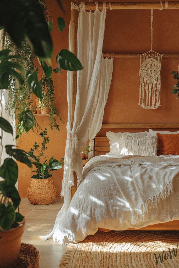 Transform your space into a nature-inspired retreat by mixing clay-colored walls with lots of lush green plants. You’ll feel like you’re in a greenhouse getaway! Add macramé plant hangers and wooden elements to enhance the natural vibe.