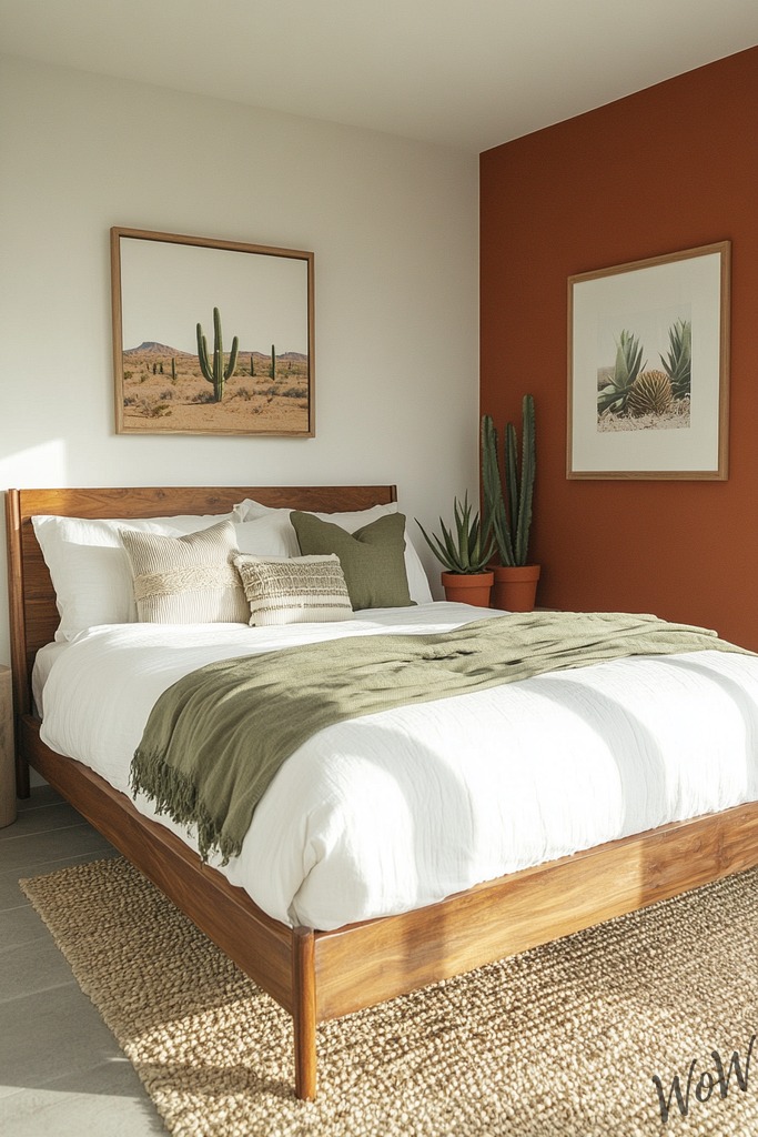 Create your own desert oasis by combining sage green bedding with terracotta wall accents and desert-inspired artwork. You can add cacti and succulents in clay pots to really nail the desert vibe.