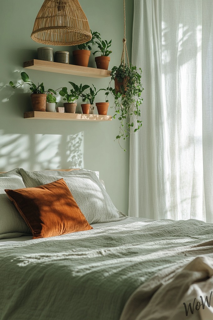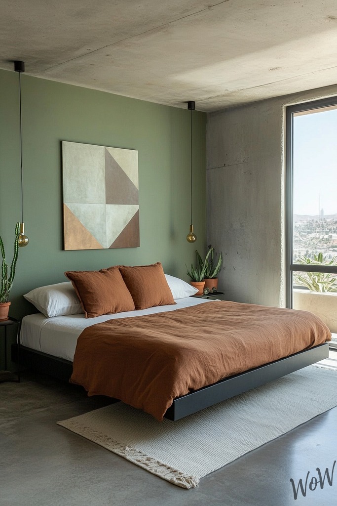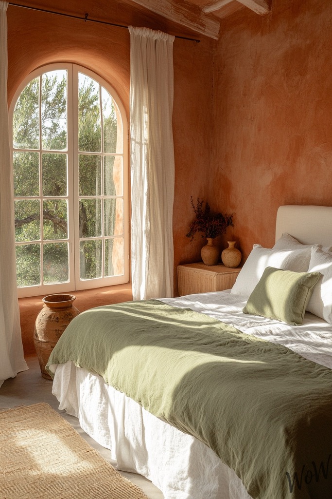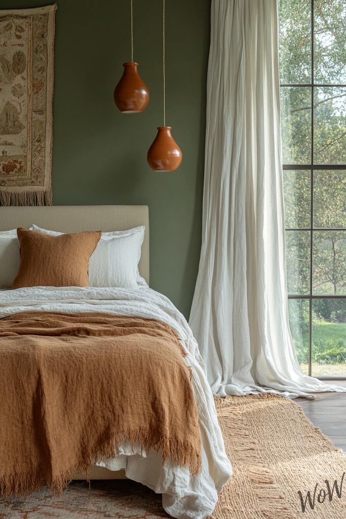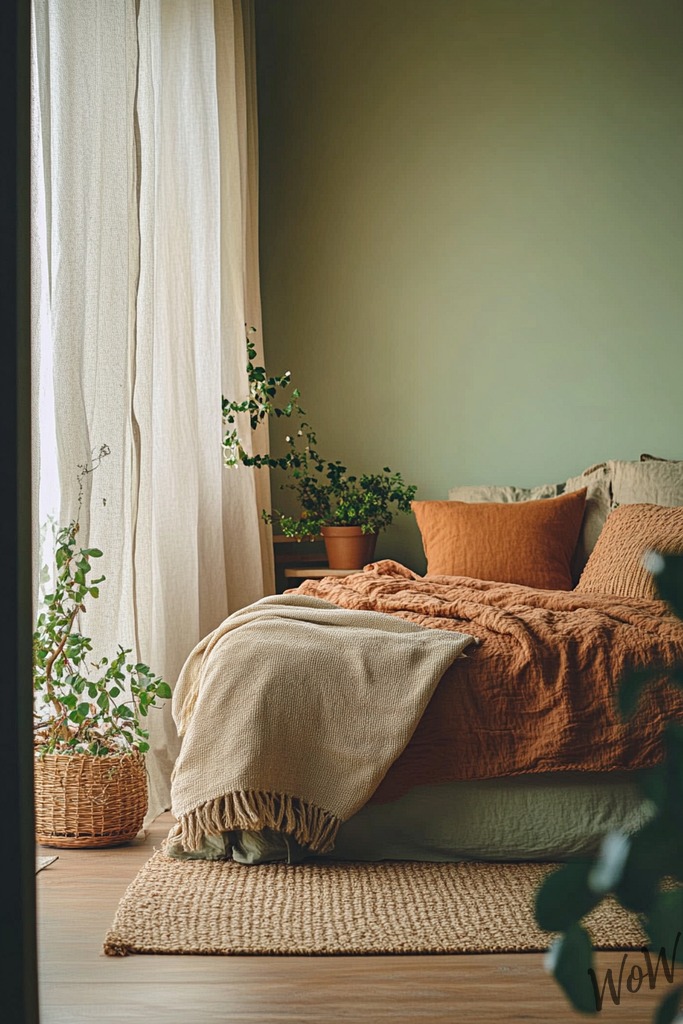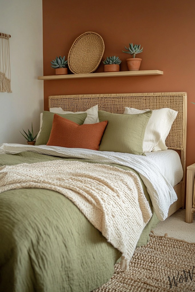To nail this look, start with sage green paint and layer in terracotta pillows, plant pots, and artwork. Keep your bedding light and natural to balance the colors.