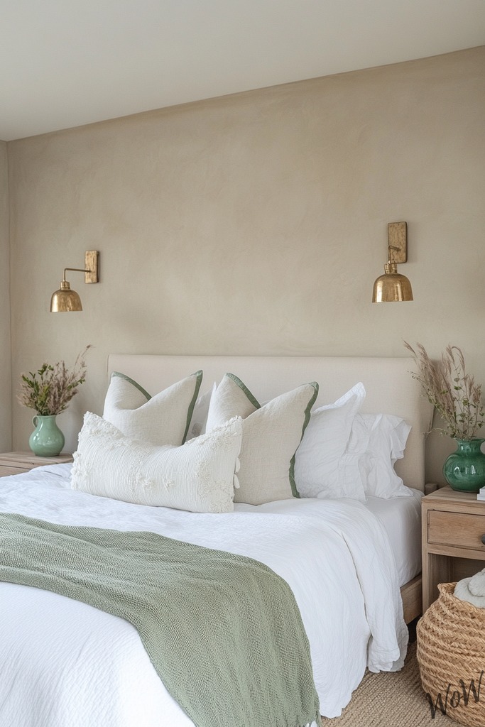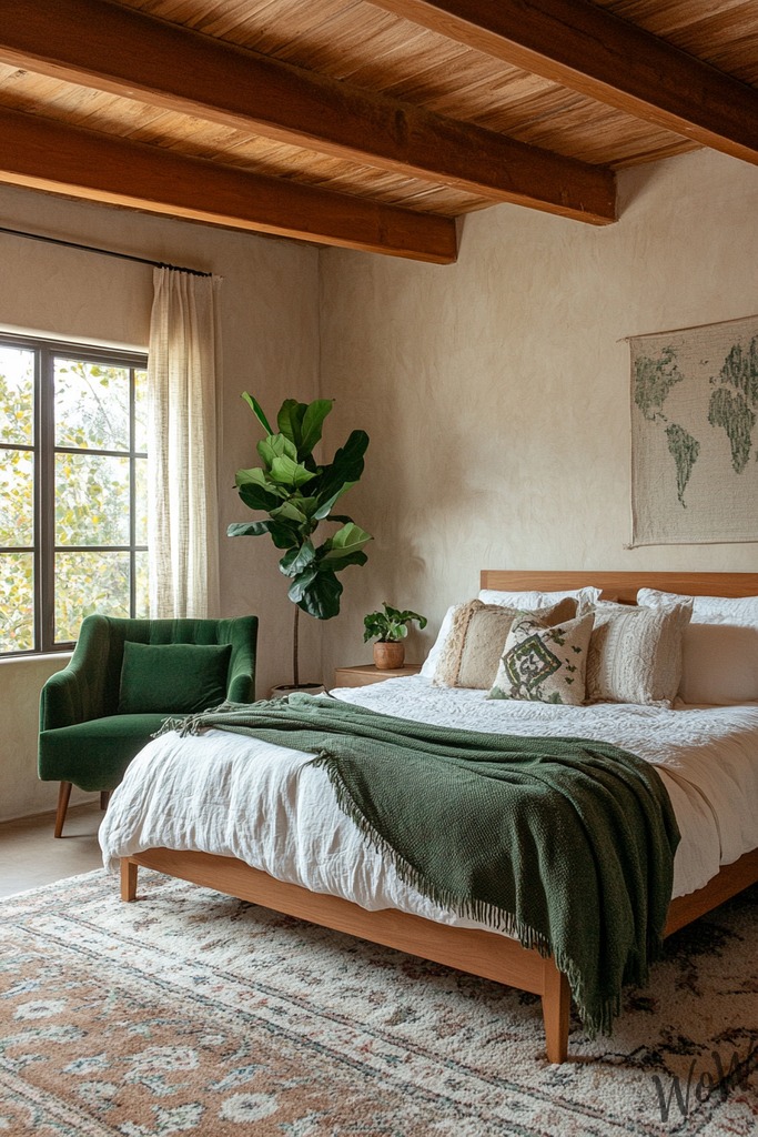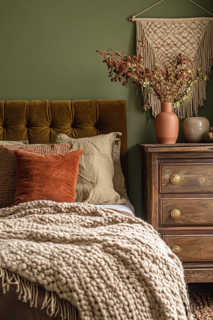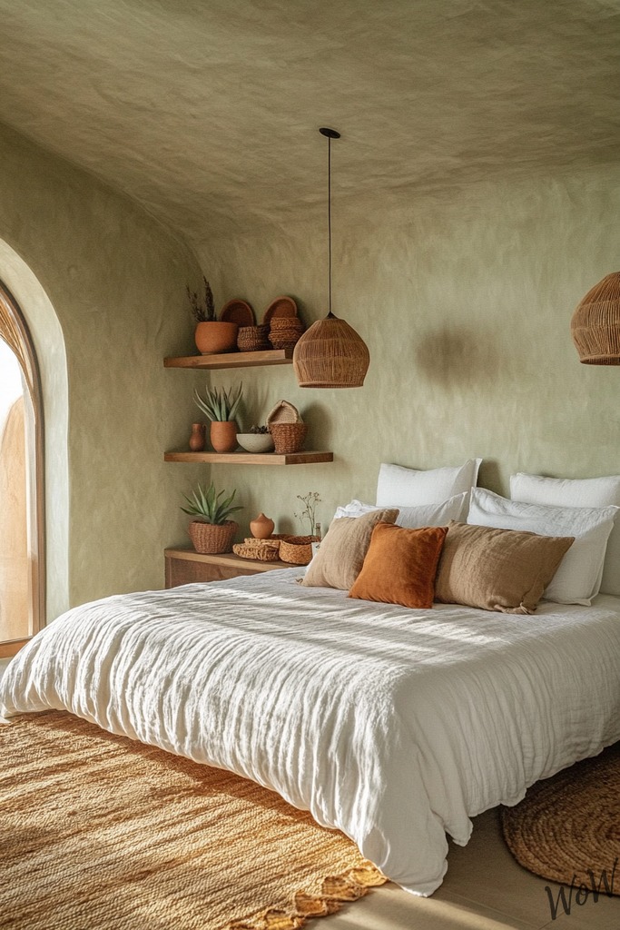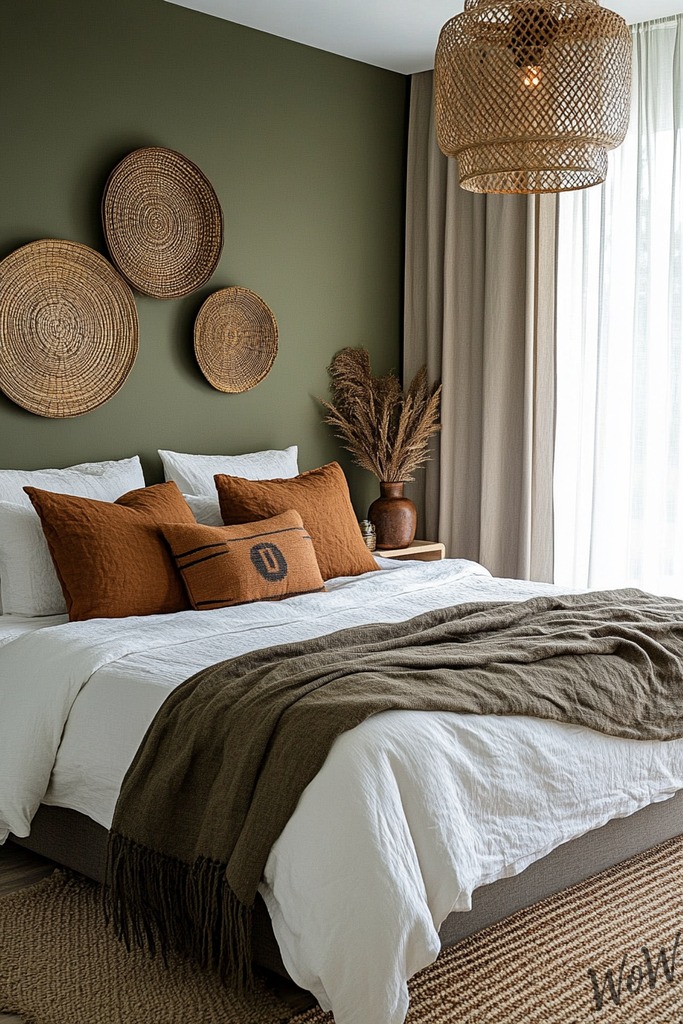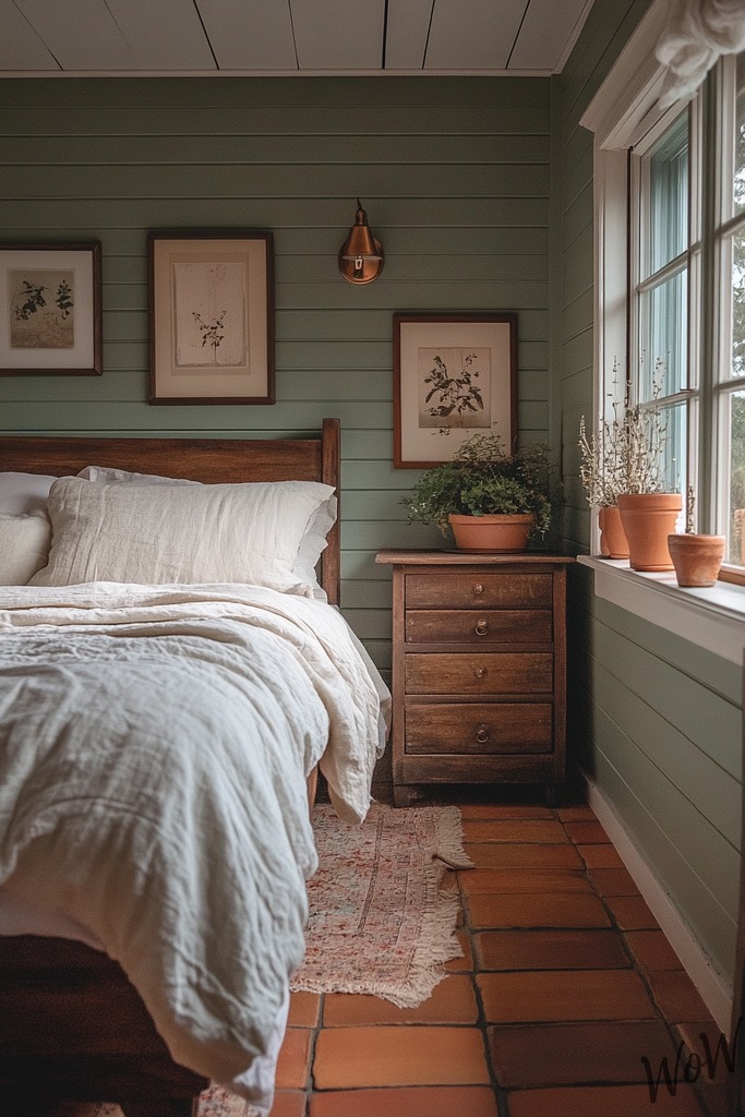 To nail this look, start with sage green paint and layer in terracotta pillows, plant pots, and artwork. Keep your bedding light and natural to balance the colors.