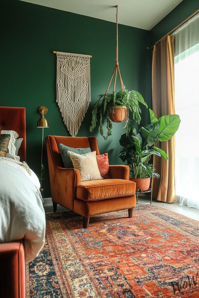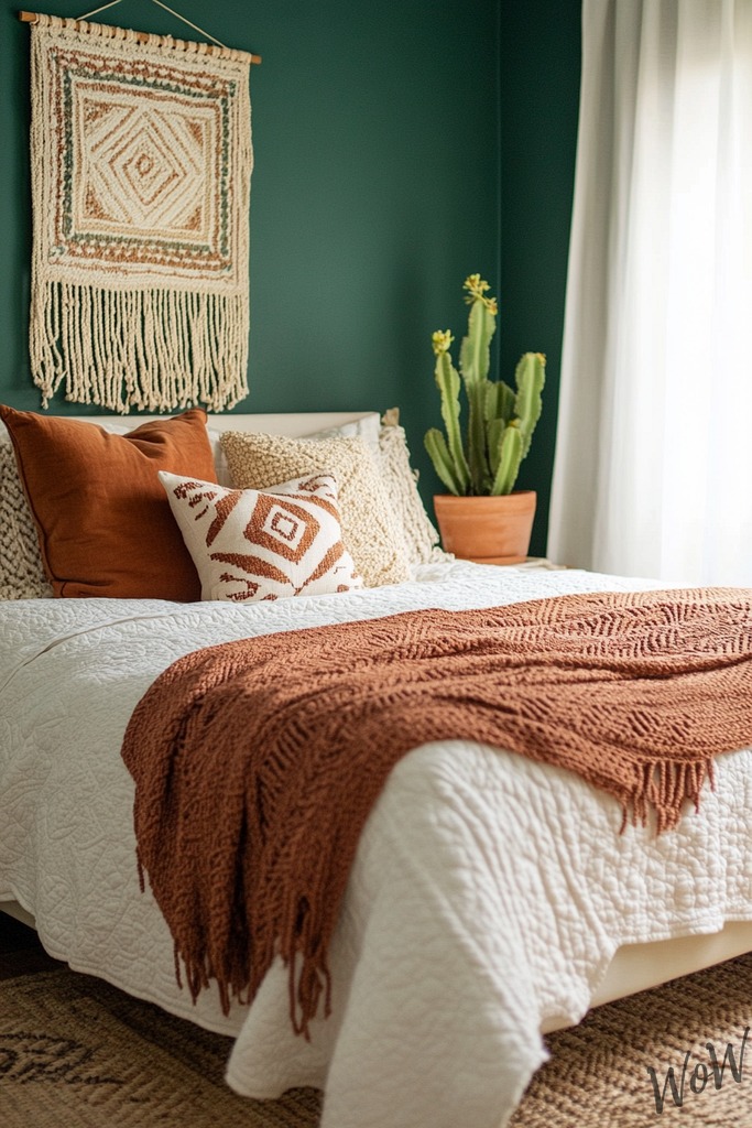 Let rich emerald green be your bold backdrop while sprinkling in terracotta planters and rust-colored textiles for a free-spirited feel.