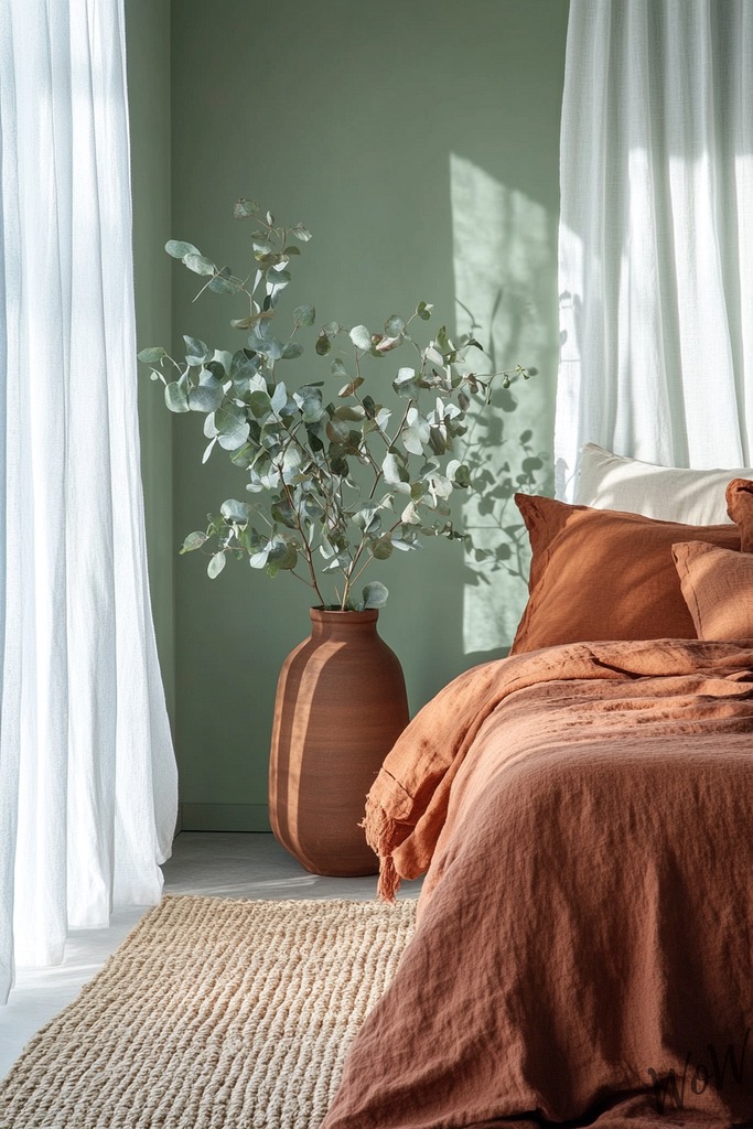 Blend soothing eucalyptus green walls with rust-colored bedding for a naturally calming bedroom. You can add depth by including different shades of terracotta in your decorative items like cushions and artwork.