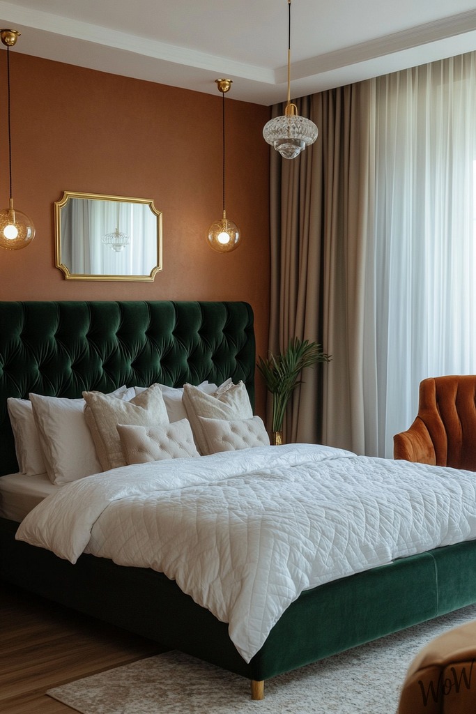Make a bold statement with a deep forest green velvet headboard against terracotta walls. This rich combination feels super luxurious and cozy at the same time.