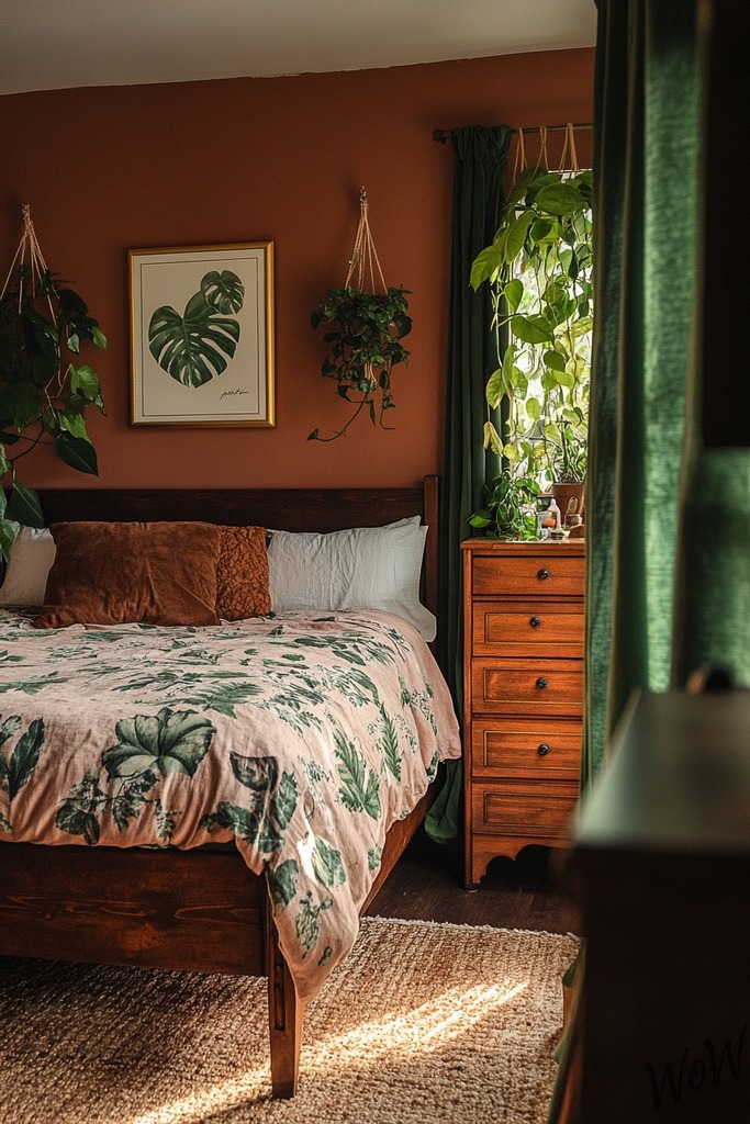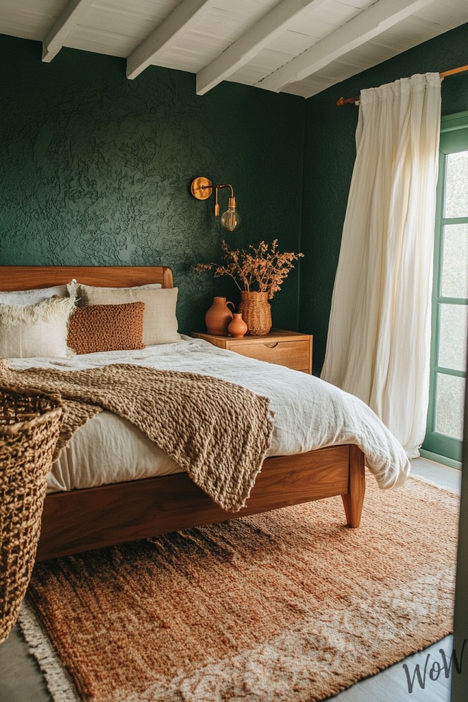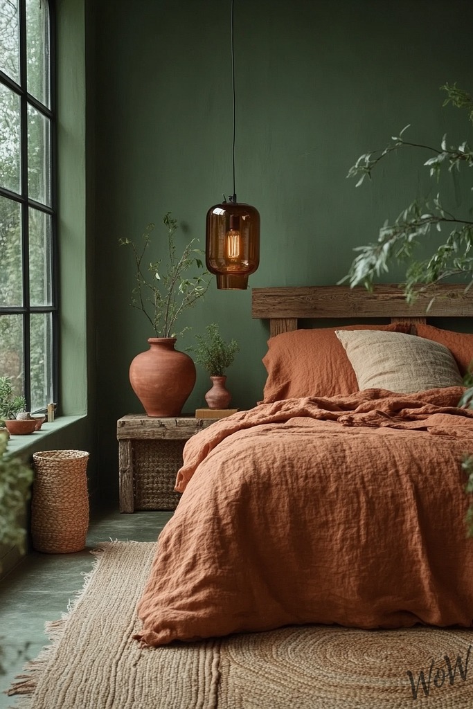 Design a cozy retreat using forest green walls and terracotta bedding for a grounding, nature-inspired feel. You can layer different textures like wooden furniture, clay decorative pieces, and woven textiles to create depth.