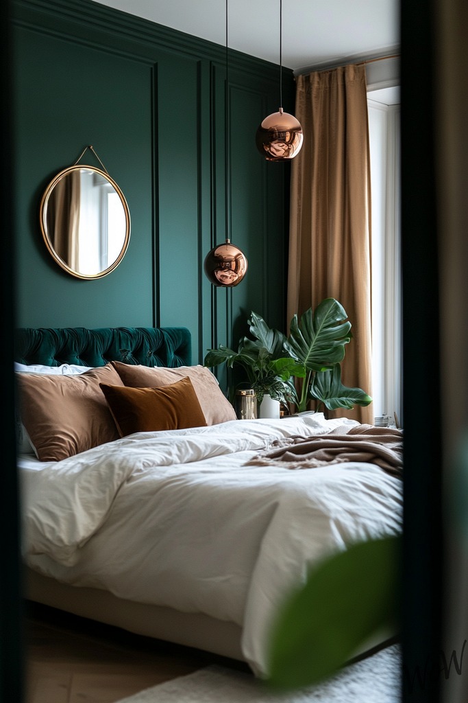 Make your bedroom feel like a luxury tropical getaway by combining deep emerald green walls with rich terracotta velvet accents. You’ll create a dash of drama by adding large-leaf plants like monstera or fiddle leaf fig, while copper light fixtures add warmth and sparkle.