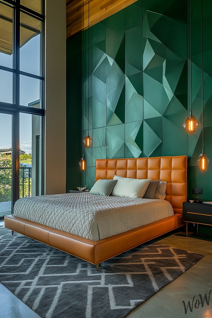 Give your bedroom a contemporary edge by blending forest green accent walls with sleek terracotta-colored furniture pieces. You’ll love how the clean lines and minimal decor create a sleek and sophisticated look.