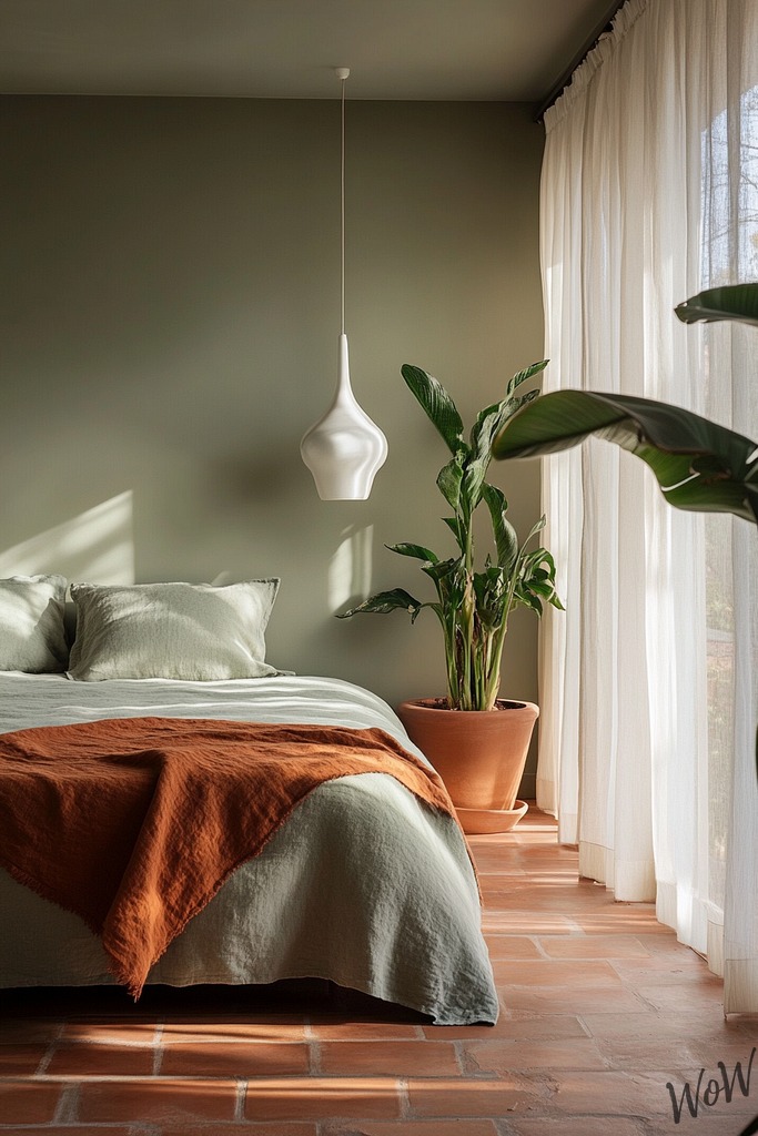 Create a peaceful bedroom by combining soft moss-green walls with terracotta accents that feel both modern and natural. You’ll love how the earthy terracotta floor tiles or plant pots pop against sage-colored bedding.