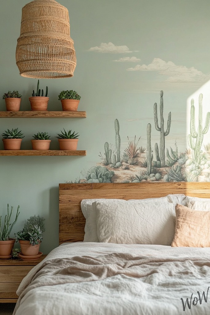 Your bedroom will feel like a peaceful garden retreat, especially when you add a desert-inspired mural or botanical prints. Keep the bedding simple in neutral tones to let your plant collection steal the show.