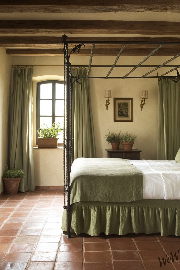 Transform your bedroom into a sunny Mediterranean retreat by pairing olive green walls with terracotta tiles and whitewashed furniture. Add wrought iron accents and potted herbs to really bring that European garden feeling indoors.