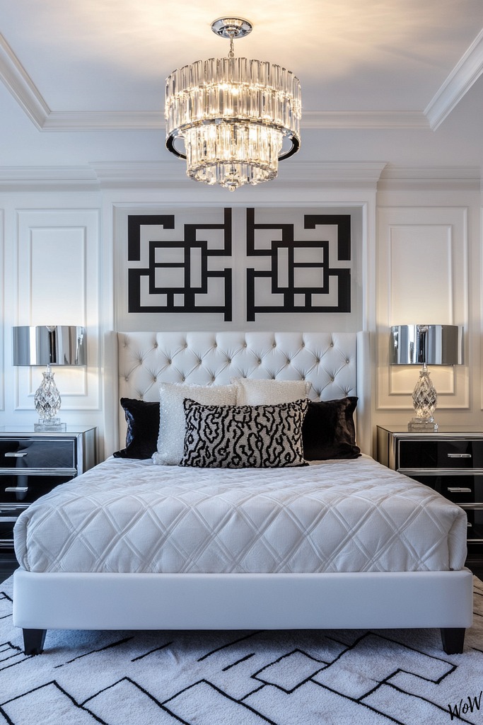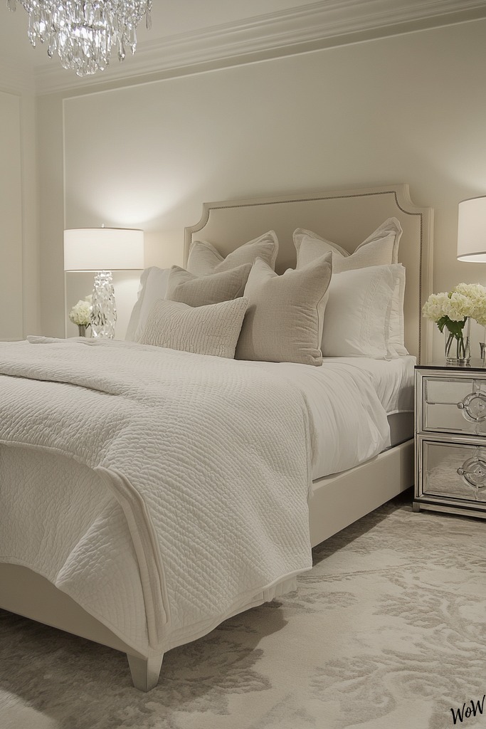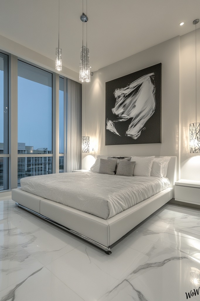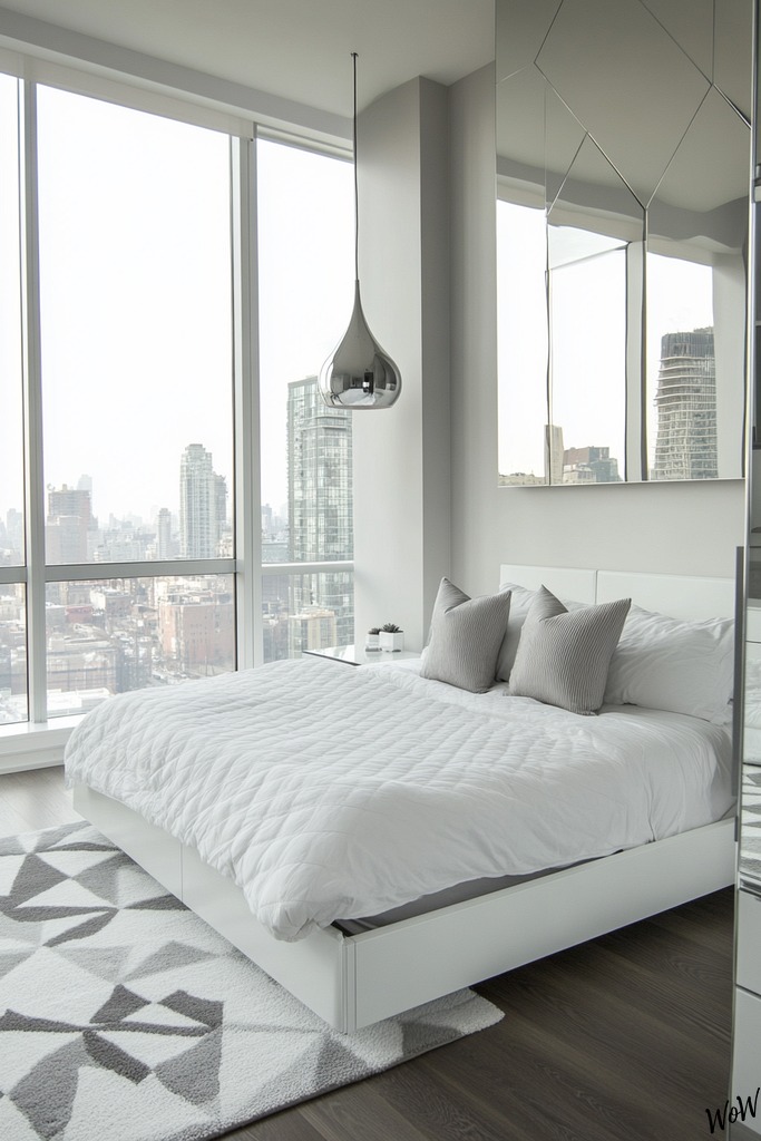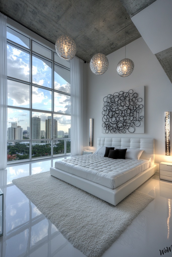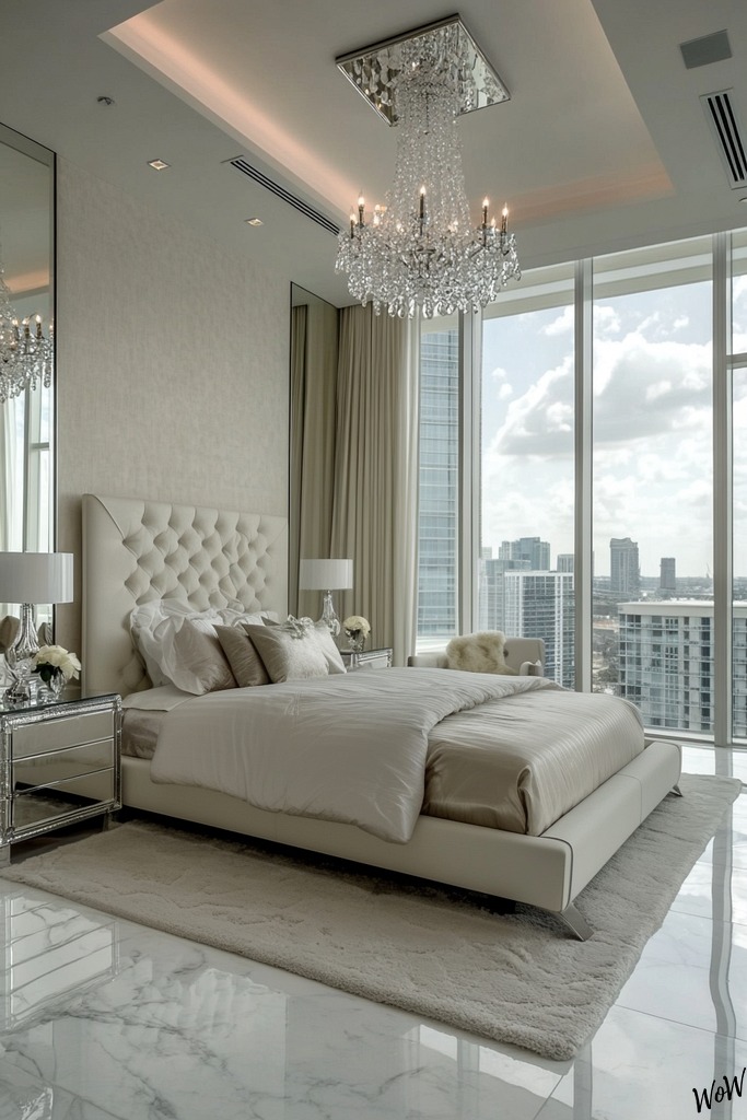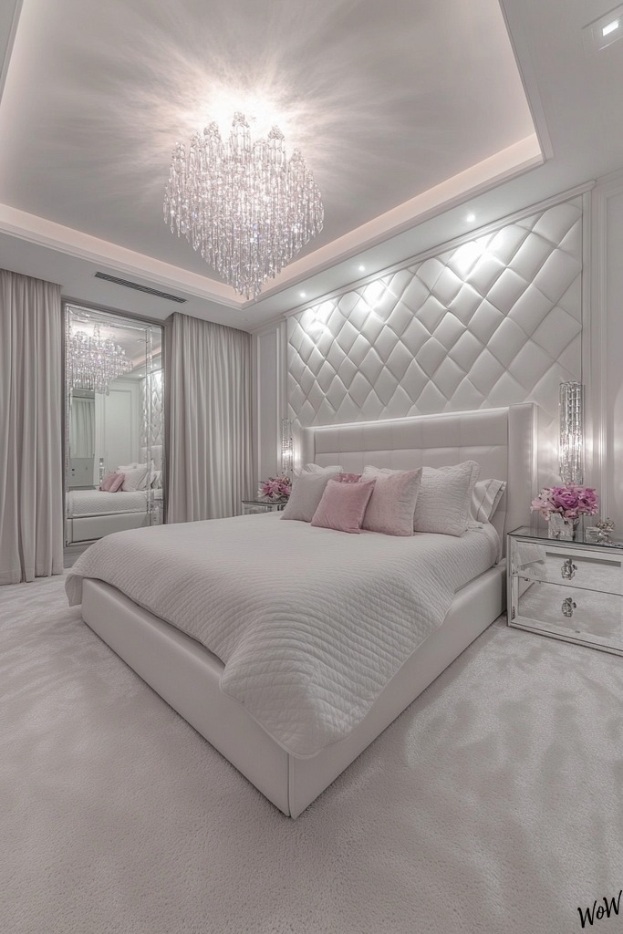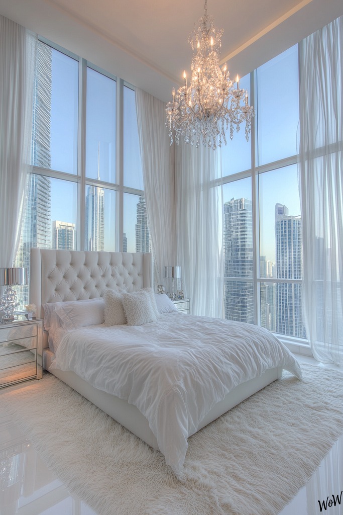 Your bedroom can feel like a high-end hotel suite with bright white walls, plush carpeting, and gleaming chrome details. Mix in crystal chandeliers and mirrored furniture to create that luxurious penthouse vibe, and don’t forget to add some velvet throw pillows in pure white.