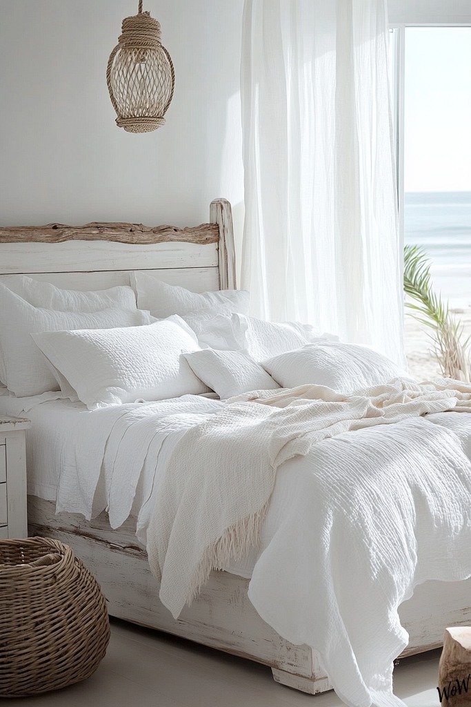 Bring beach vibes into your bedroom with this breezy white theme that feels like a seaside getaway. Mix in natural textures like white-washed wood furniture, rope details, and woven baskets to capture that coastal charm.