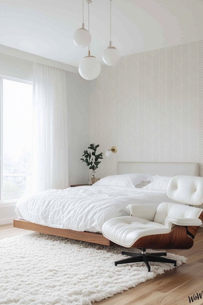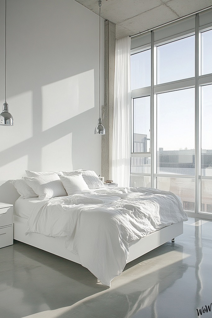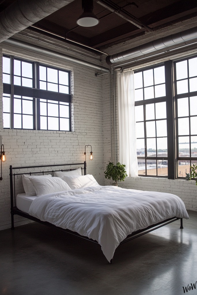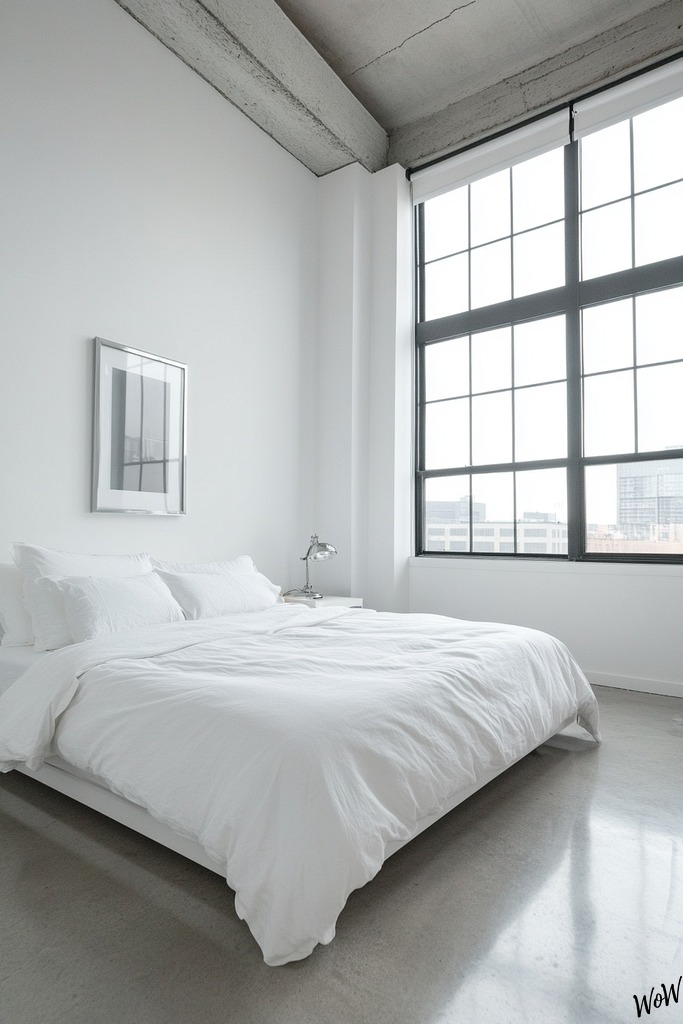 Combine white walls with raw elements like exposed brick or metal fixtures for an urban feel. Add white bedding and furniture but keep some industrial touches like metal bed frames or concrete floors.