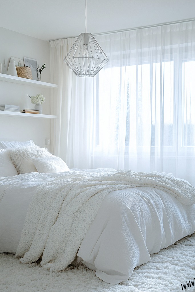 Transform your bedroom into a dreamy escape with soft, cloudy textures and pure white tones. Layer different shades of white using plush bedding, fluffy pillows, and a thick area rug to create depth without using other colors.