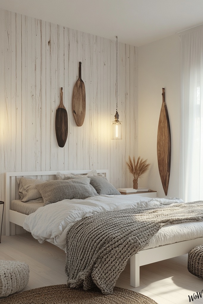 Picture yourself walking into a breezy, light-filled room that feels like a seaside escape. You can create this look with white-washed wooden furniture, soft cotton bedding, and sheer curtains that dance in the ocean breeze.