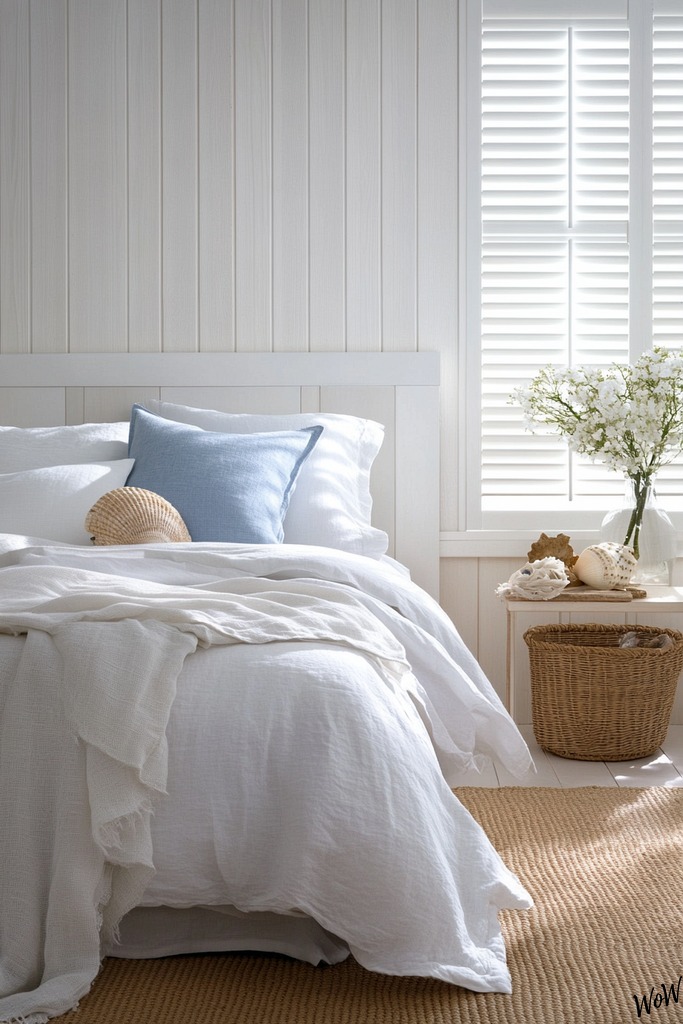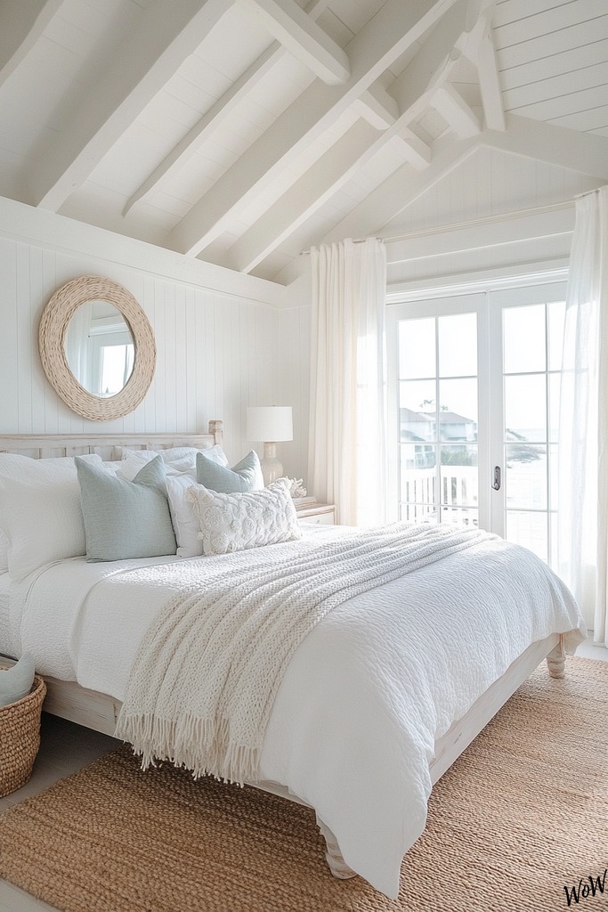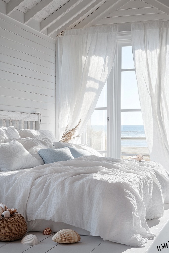 Do you want to feel like you’re waking up at a peaceful beach house every morning? A white coastal cottage bedroom brings that serene seaside feeling right to your home! Start with pure white walls and bedding as your base, then add subtle touches of sandy beige and soft blue accents to create that perfect beach vibe.