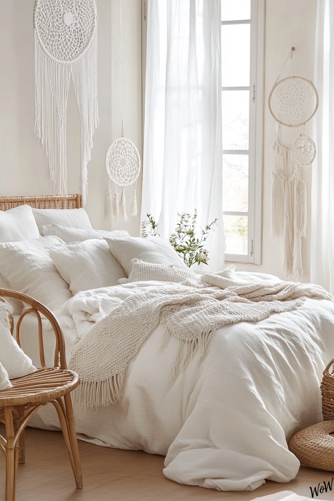 Mix different white textures to create this laid-back, cozy vibe. Try adding macramé wall hangings, fluffy pillows, and a chunky knit blanket – all in various shades of white.