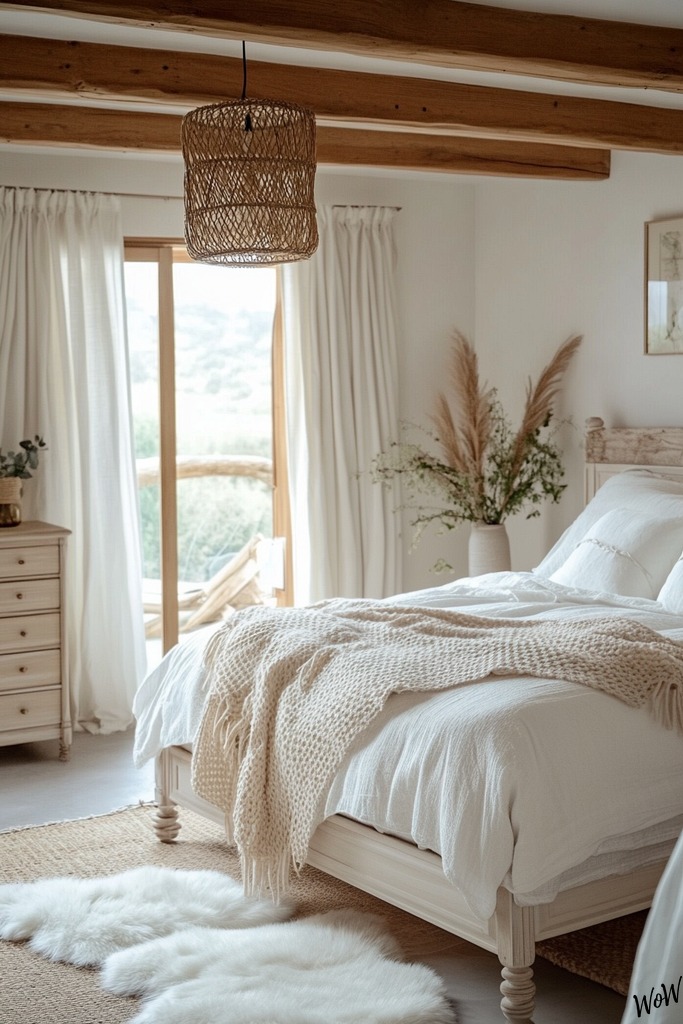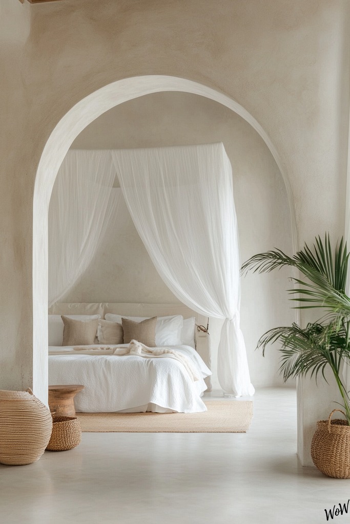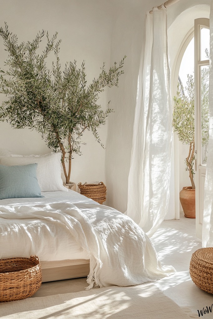 Transform your bedroom into a breezy coastal retreat with crisp white walls and flowing sheer curtains. You’ll love how terracotta pots filled with olive plants and woven baskets add natural warmth to the space.