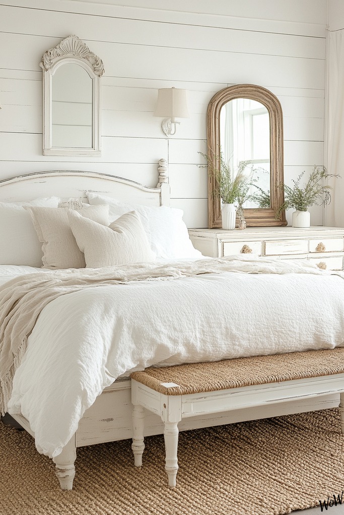 You can add some rustic touches like a white wooden bench at the foot of your bed or antique picture frames painted white.