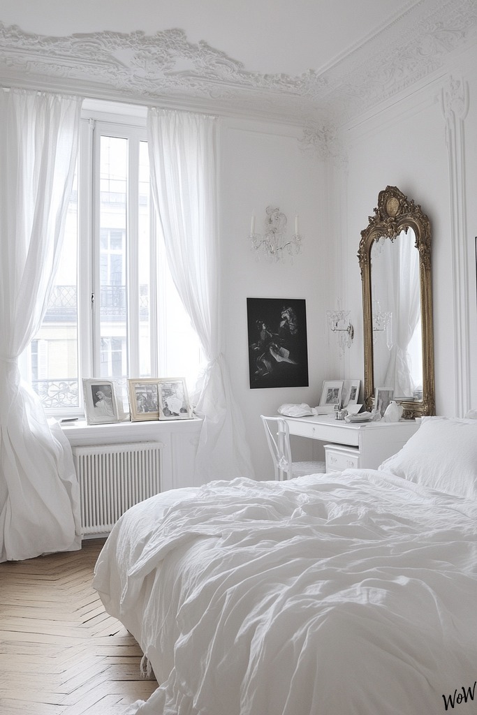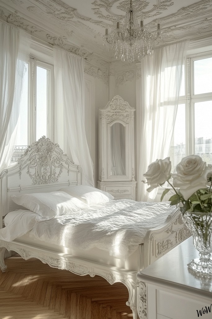 Transform your bedroom into a romantic Parisian escape with delicate white furniture and curved details. You’ll love how the soft, creamy whites blend with vintage-inspired pieces like an ornate headboard and elegant dressing table.