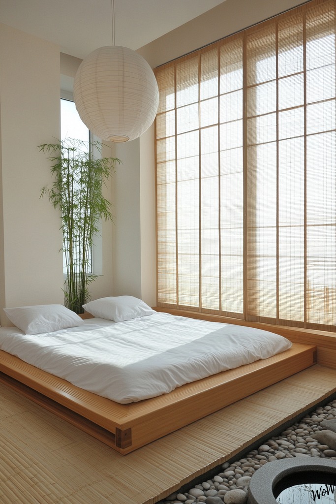 Create your own peaceful hideaway with minimalist white walls and natural bamboo accents. Your space will feel instantly calmer with a low platform bed and simple paper lanterns casting soft shadows.