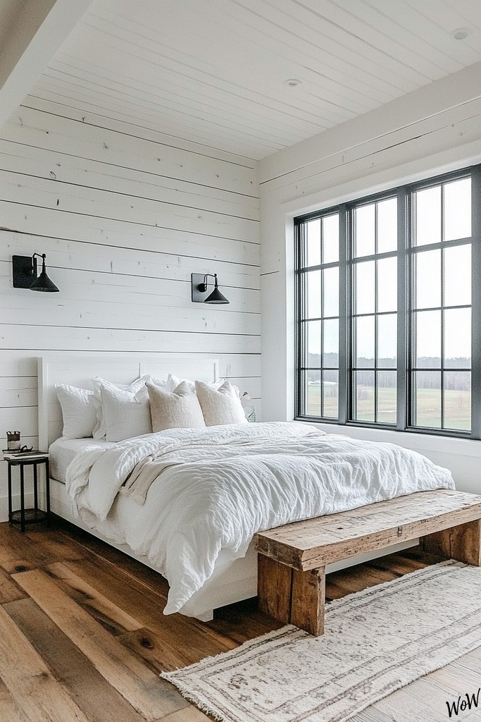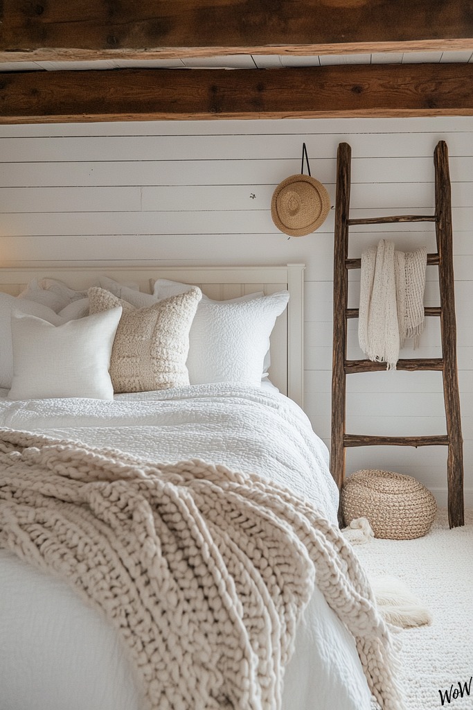 Bring the cozy cabin feel home with white-painted shiplap walls and natural wood beams. Your bed will look extra inviting with layers of white linens and chunky knit throws.