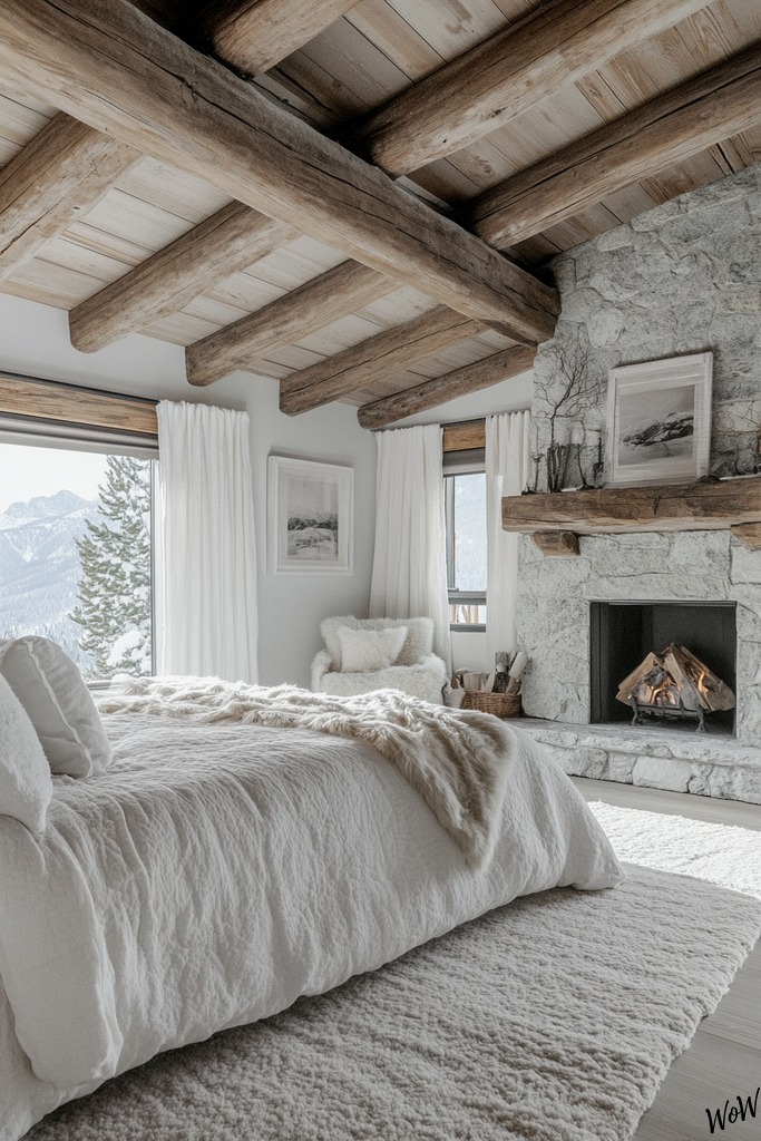Bring the peaceful feeling of snow-capped mountains into your bedroom with this cozy white design. Layer different shades of white with fuzzy blankets and soft pillows to create a warm, welcoming space.