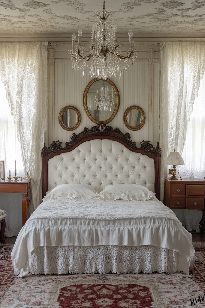 Transform your bedroom into an elegant Victorian retreat with ornate white furniture and delicate details. You’ll love the classic look of a tufted headboard, vintage-style mirrors, and lacy window treatments.