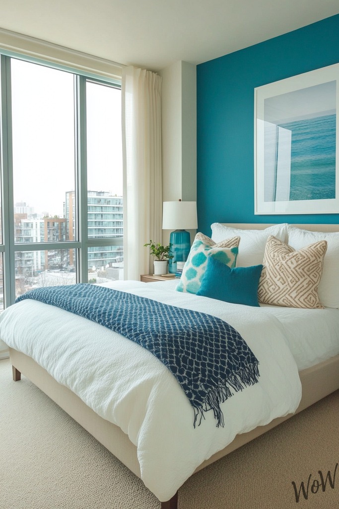Channel Mediterranean style with vibrant Aegean blue accent walls that’ll make your city bedroom feel like an absolute seaside retreat.