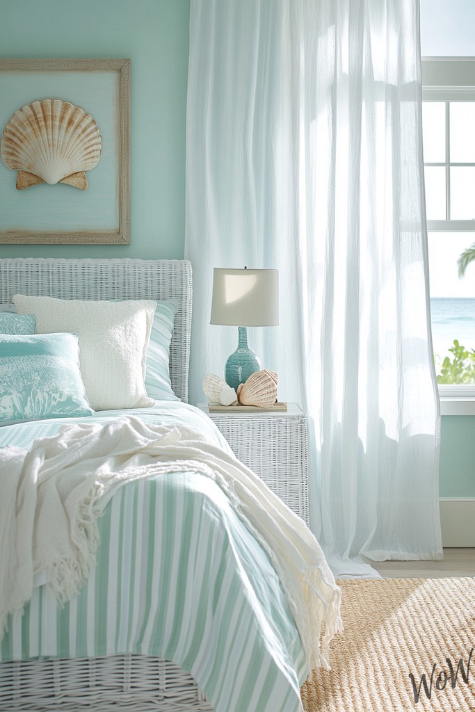 Transform your bedroom into a beachy paradise with soft aqua walls that remind you of gentle ocean waves. Add white wicker furniture and seashell decorations to bring that coastal feeling home.