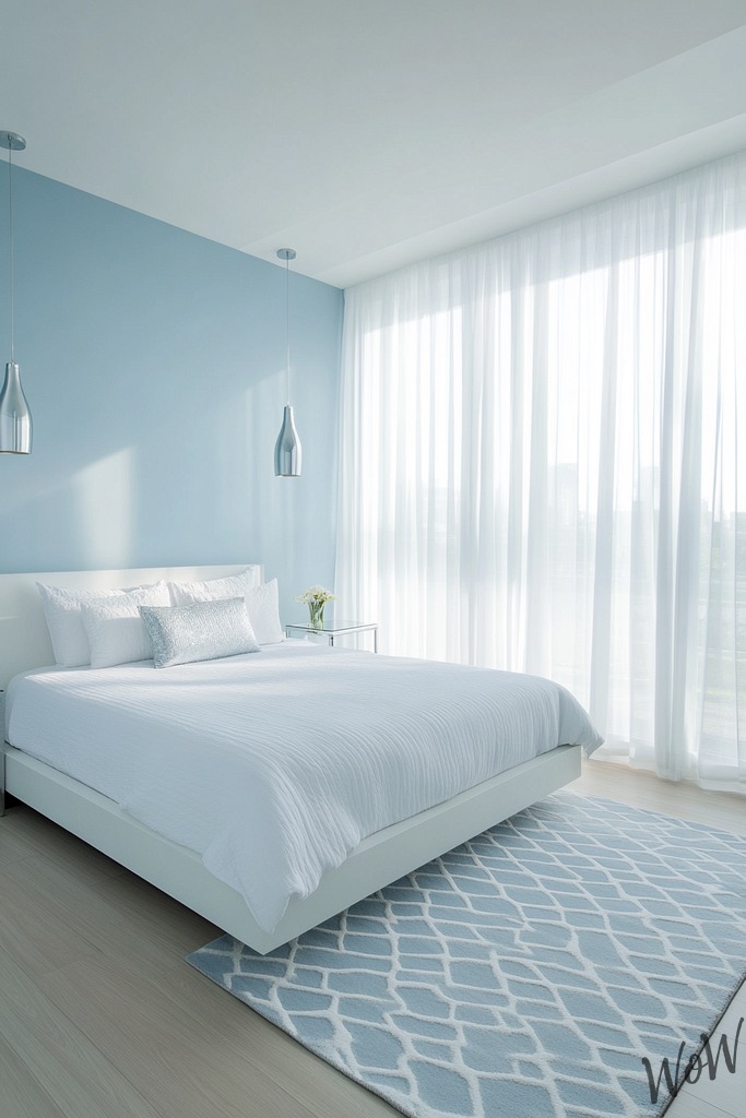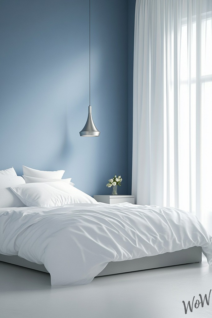 Transform your bedroom into a sleek, modern haven with cool ice-blue walls and minimalist furniture. You’ll love the way pale blue creates a peaceful vibe while chrome accents and white bedding keep things fresh and contemporary.
