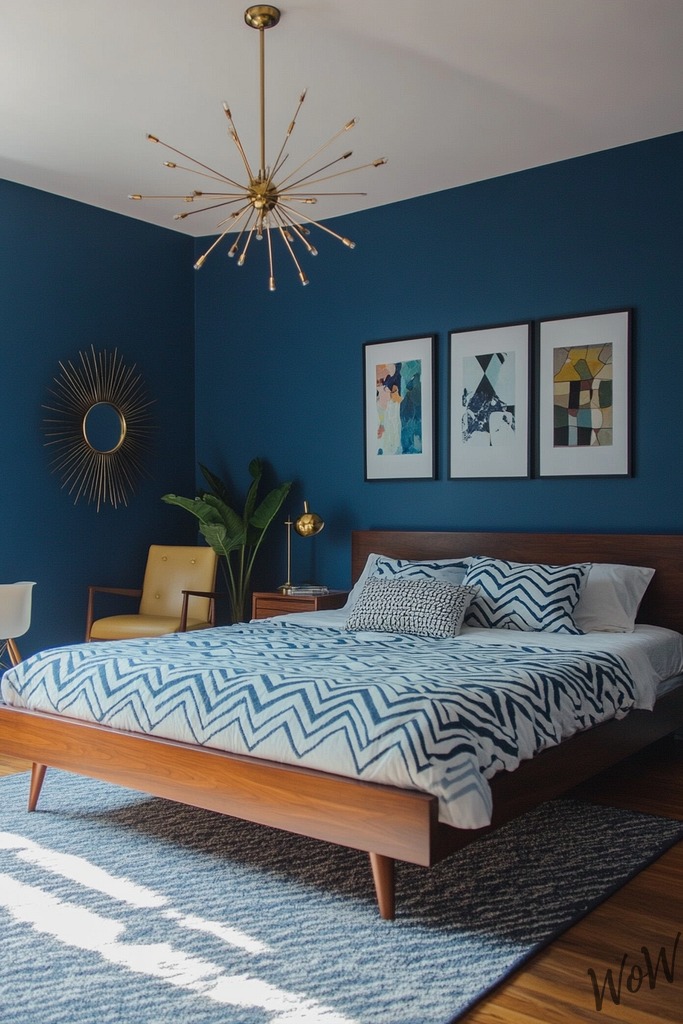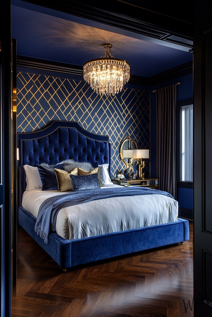 Wow everyone with this bold bedroom, Mix deep royal blue walls accented by gold geometric patterns and luxurious velvet fabrics to make your space instantly feel more glamorous.