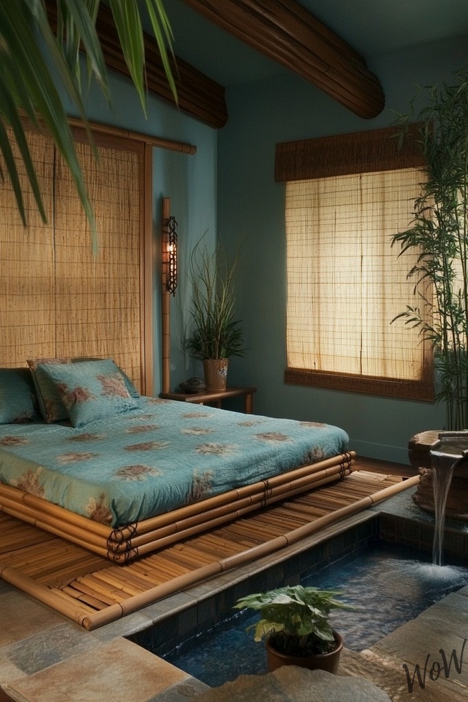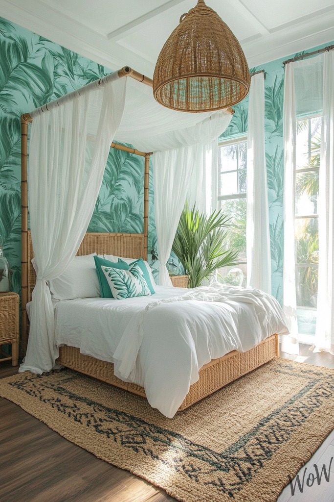 Brighten your room with vibrant turquoise walls that remind you of crystal-clear ocean waters. Add tropical leaf patterns through pillows or wallpaper, and include natural elements like bamboo or rattan furniture to create your own paradise.