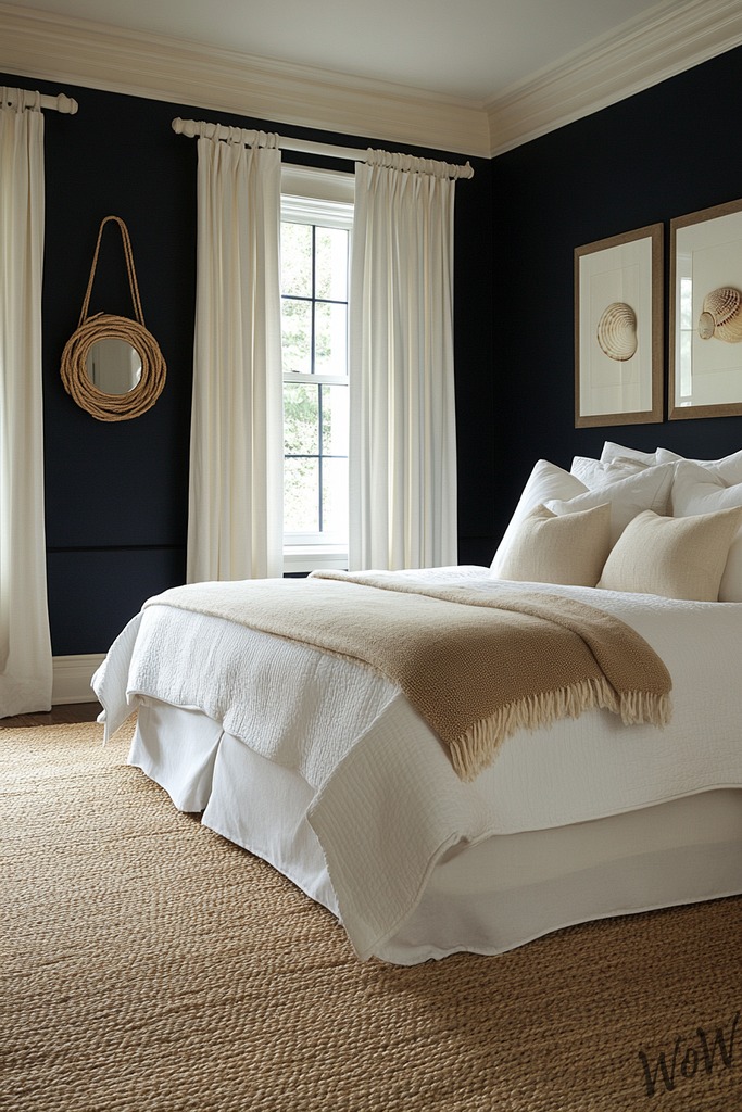Do you want to feel like you’re living in a beach house? Transform your bedroom with deep navy walls paired with crisp white trim and sandy beige accents. You’ll love how the classic navy creates a cozy cocoon feeling while still keeping things sophisticated.