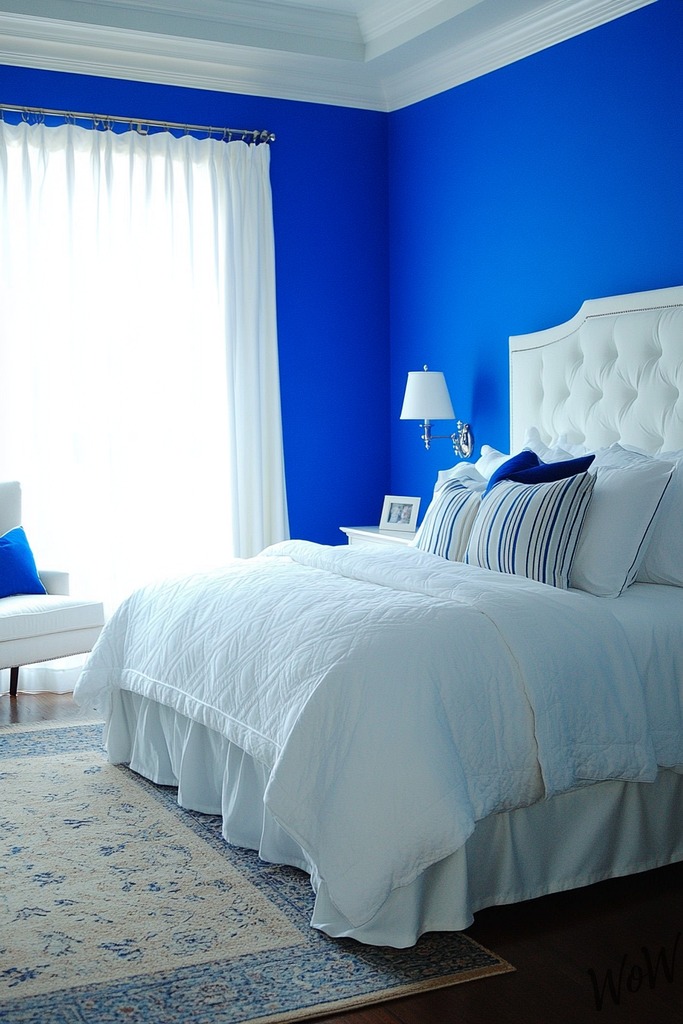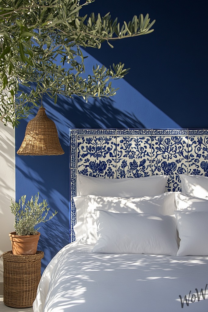 Bring a piece of Greek Islands into your bedroom with vibrant cobalt blue and pure white! Paint an accent wall in rich Mediterranean blue or use blue and white patterned tiles as your main focus.
