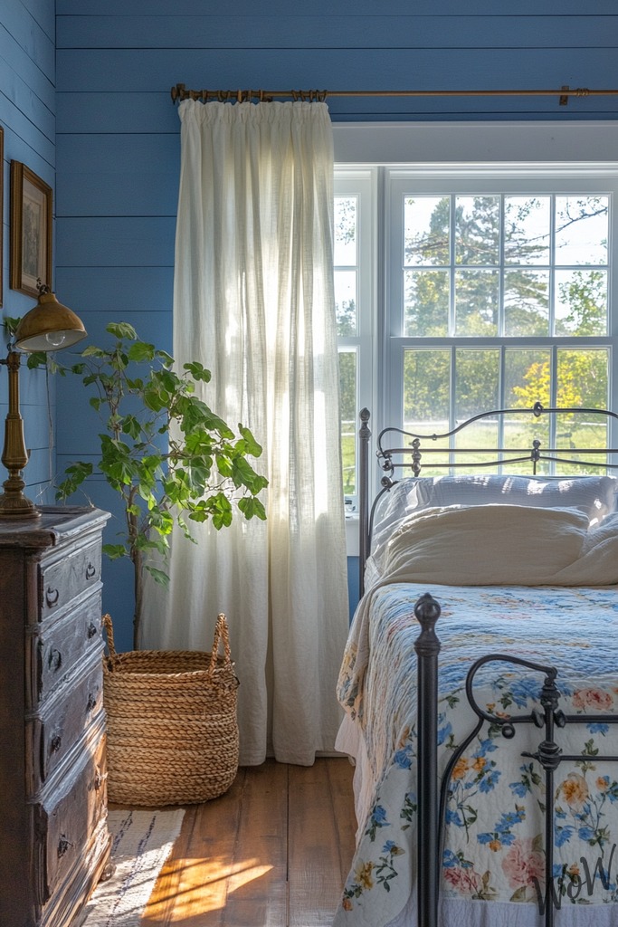 Bring charming country vibes to your space with soft cornflower blue shiplap walls and vintage white furniture. Mix in some floral patterns and weathered wood pieces to achieve that cozy farmhouse feel you’re after.