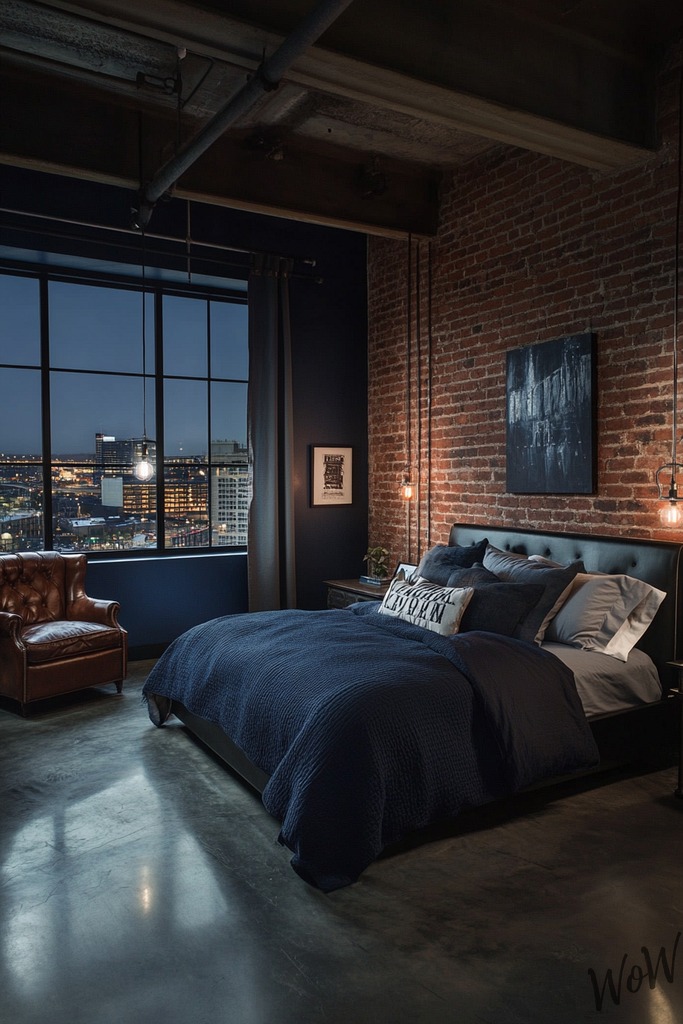 Add some vintage metal signs, Edison bulb lighting, and maybe even a metal pipe shelf to complete the industrial look. Keep your bedding simple with solid grays or whites to let that unique denim blue stand out.