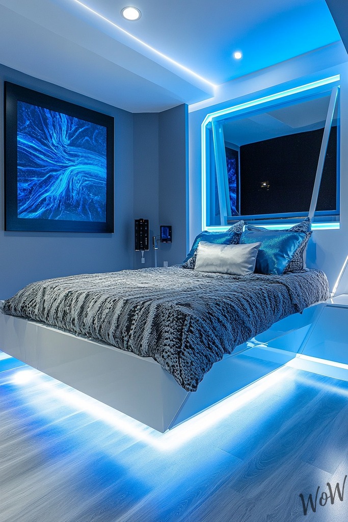 Make your space super cool with bold electric blue walls that pop! Add fun LED strip lights around your ceiling or bed frame, and pick out modern furniture with clean lines.