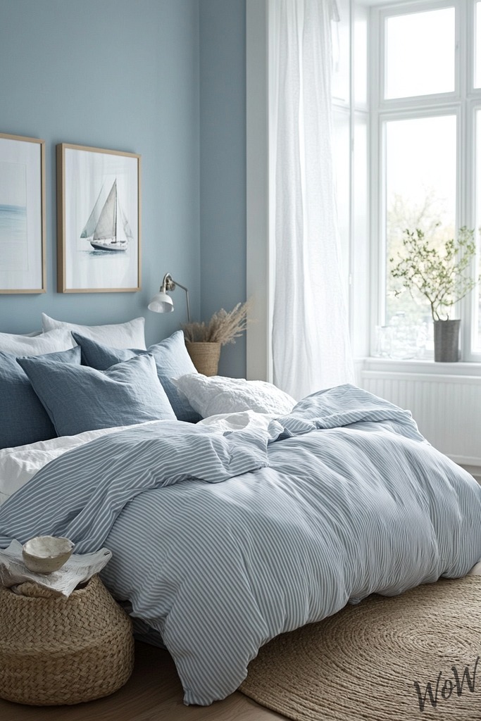 You can make your room super comfy with light wood furniture and striped blue-and-white bedding. Try hanging some boat pictures or adding rope details to bring in that seafaring feeling!