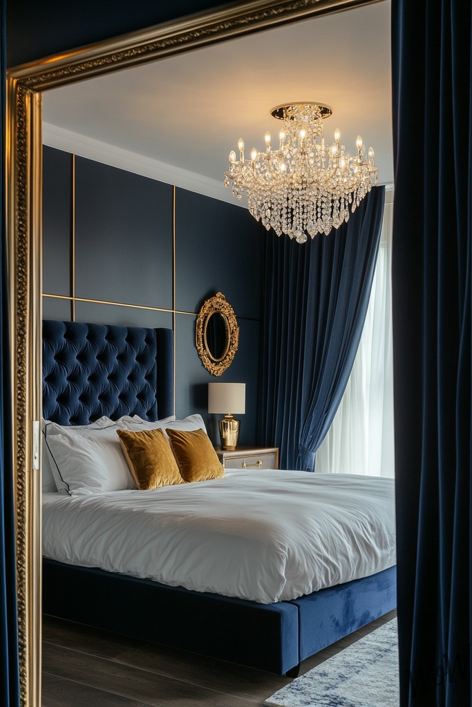 Make your bedroom feel like a luxury hotel suite by pairing rich navy blue walls with glamorous gold accents. You can create this touch of elegance with velvet navy curtains, gold-framed mirrors, and metallic throw pillows.