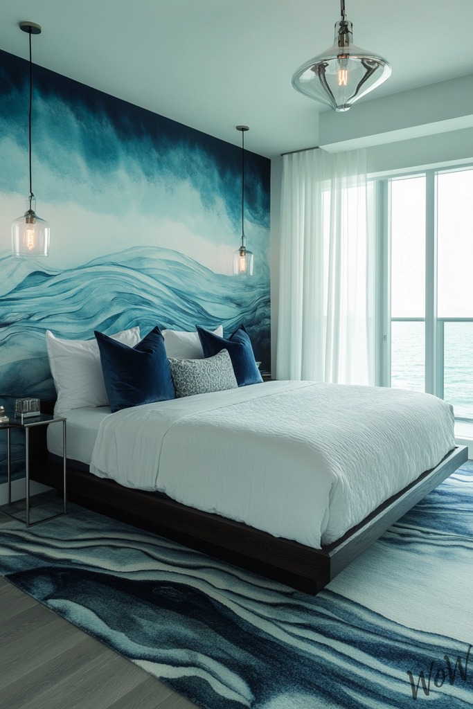 Revamp your bedroom into a calming coastal retreat with gentle wave patterns and modern furniture. You can achieve this look by painting rolling wave designs on an accent wall using different shades of blue and white.