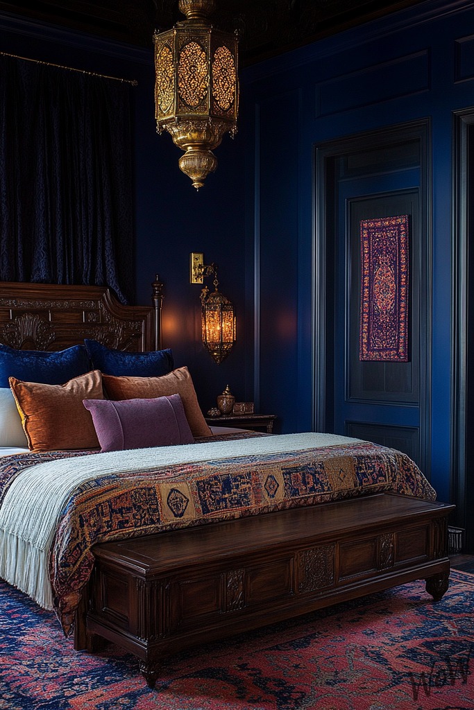 You can hang colorful tapestries, add Moroccan lanterns, and spread out patterned rugs in complementary colors. Try mixing metallic gold accessories with your blue theme to make the room feel extra magnificent.