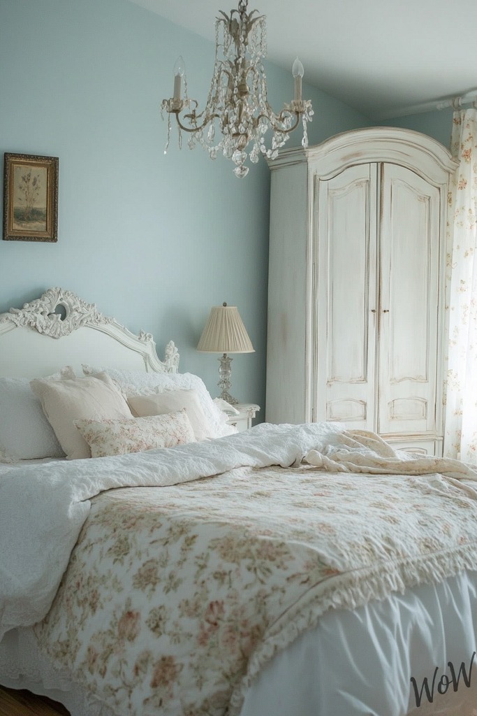 Get that charming French farmhouse look with delicate powder blue walls and vintage-inspired furniture. Add white-washed pieces and antique-style mirrors to create an elegant but lived-in feel.