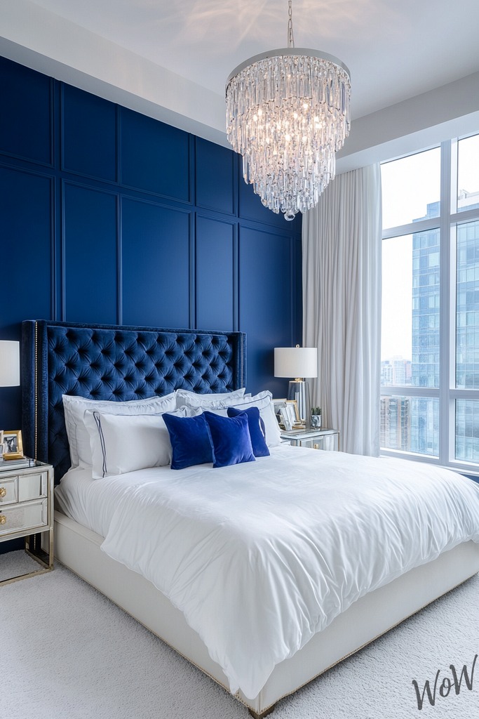 Make your bedroom feel like a luxury hotel suite with glamorous sapphire blue accents and plush textures. Mix in mirrored furniture, crystal lighting fixtures, and velvet upholstery to create that ultra-luxe feeling.