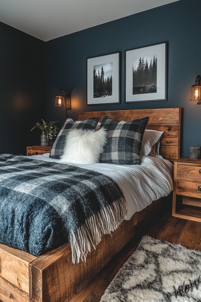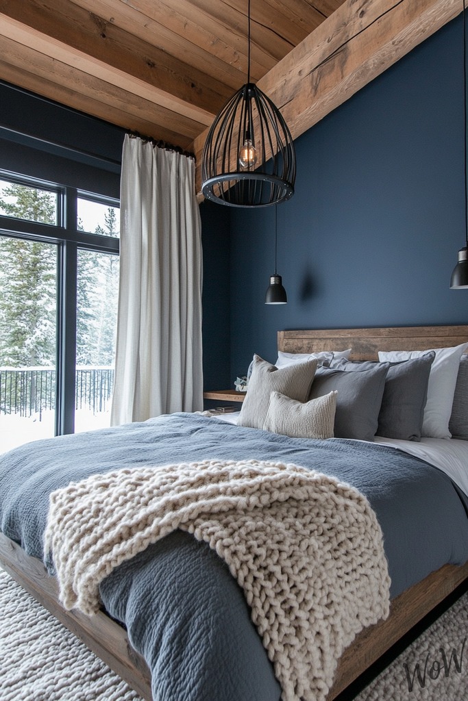 Get cozy with this perfect blend of modern comfort and rustic charm! Your bedroom will feel like a mountain retreat when you combine steel blue walls with natural wood elements and industrial-style lighting.