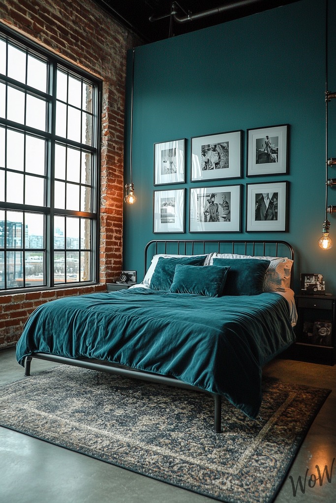 Blend in raw industrial elements like exposed brick and metal fixtures with the sophisticated warmth of teal. You can soften the industrial edge by using teal as your main color in bedding and curtains while keeping structural elements bare and authentic.