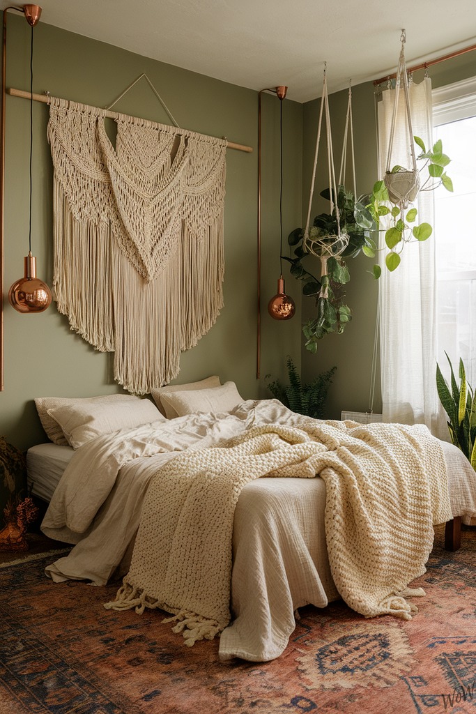 Layer different textures by combining sage walls with macramé wall hangings and chunky knit throws. You can create depth by mixing in cream-colored pillows, woven rugs, and hanging plants. Don’t forget to add some metallic accents like brass or copper to give your boho paradise some shine.