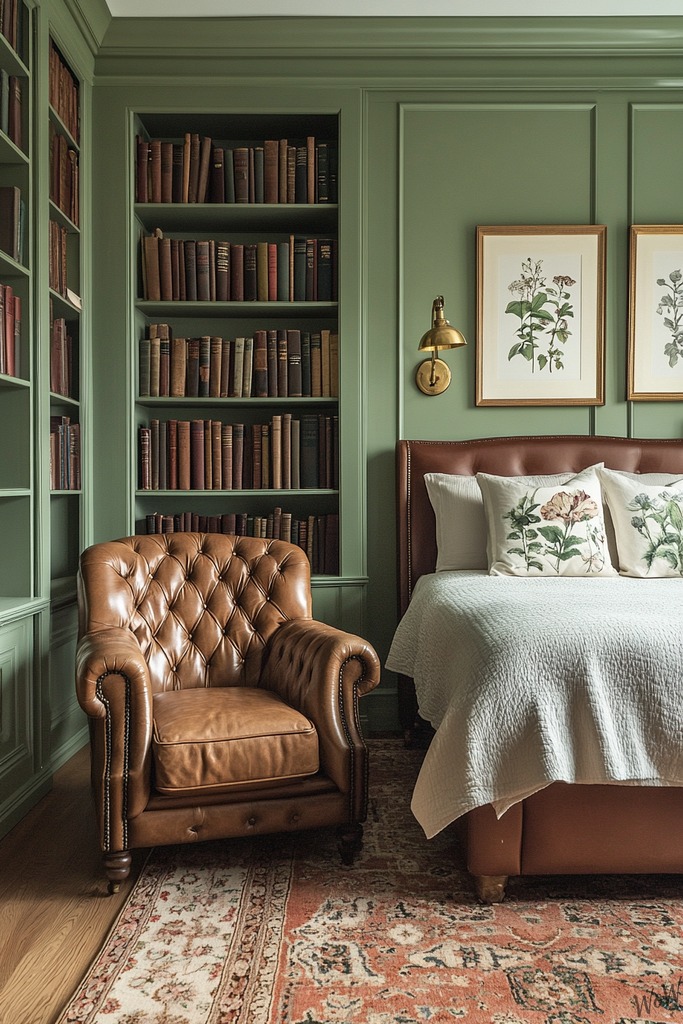 Picture yourself surrounded by floor-to-ceiling bookshelves painted in sophisticated sage, paired with rich leather furniture and brass reading lamps. Your own personal library-bedroom can feature vintage maps or botanical prints to complement the scholarly atmosphere.