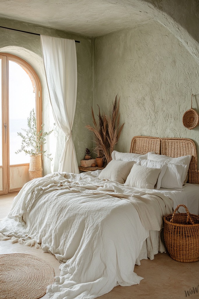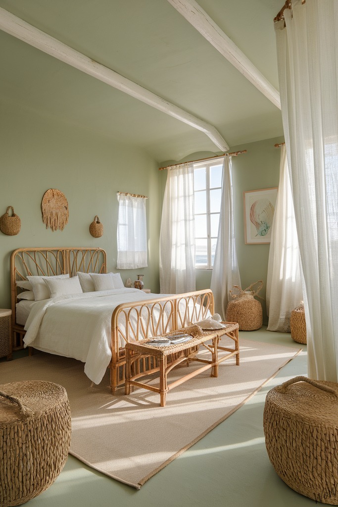 Create a beachy vibe by pairing soft sage walls with natural rattan furniture and white linens. You can add woven baskets, a rattan headboard, and coastal artwork to really bring the beach house feel home. Try adding some seashells or coral decorative pieces for that perfect oceanside touch.