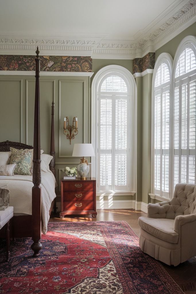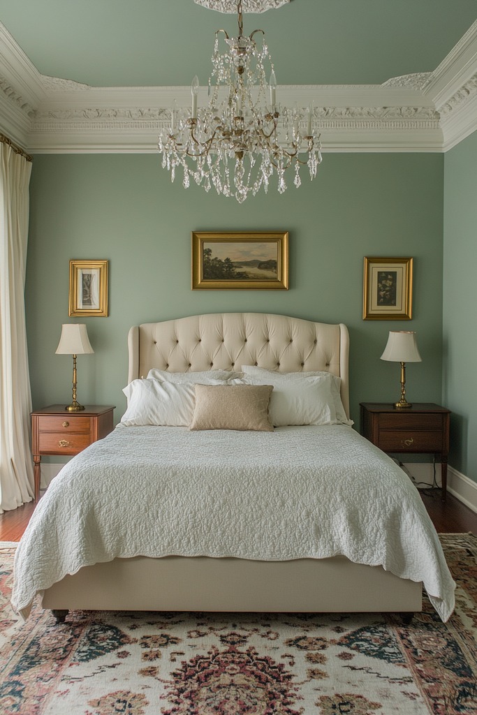 Get ready to feel like royalty with tall sage-colored walls and white crown molding. Your room will look amazing with a tufted headboard, vintage-style picture frames, and lacy curtains. Try adding some antique-looking lamps and a fancy area rug to complete the Victorian vibe.