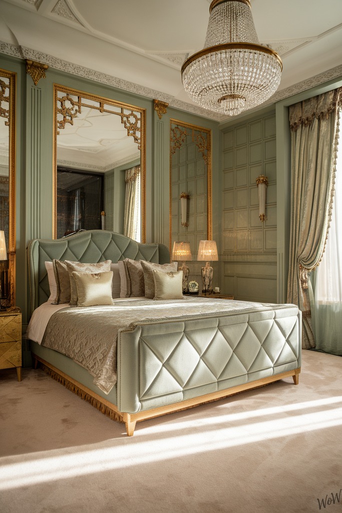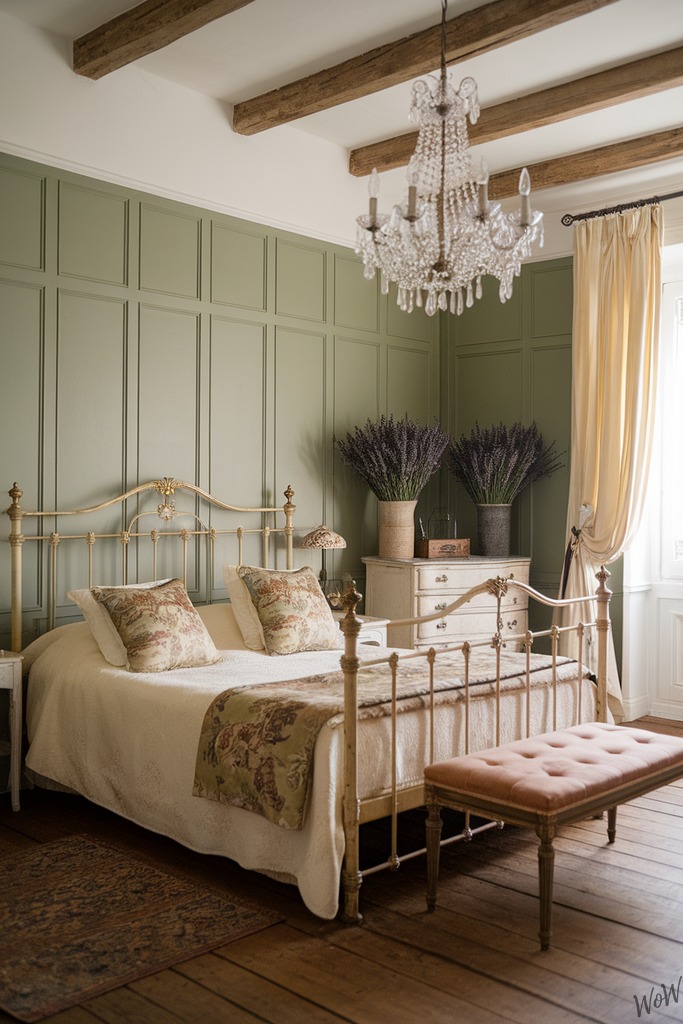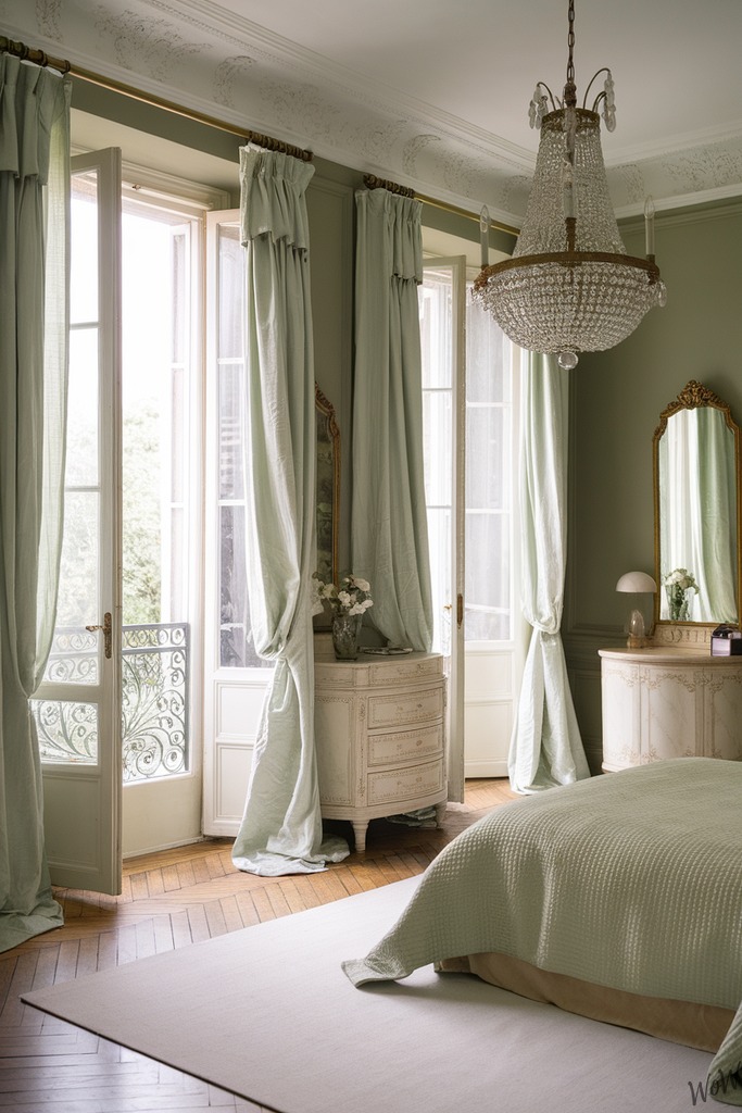 Bring the romance of Paris into your bedroom with sage walls paired with cream-colored French doors and flowing curtains. Add a crystal chandelier and a vintage vanity to create that perfect Parisian apartment feel.